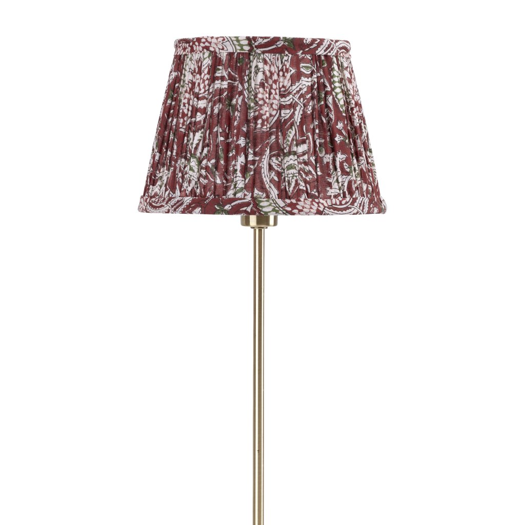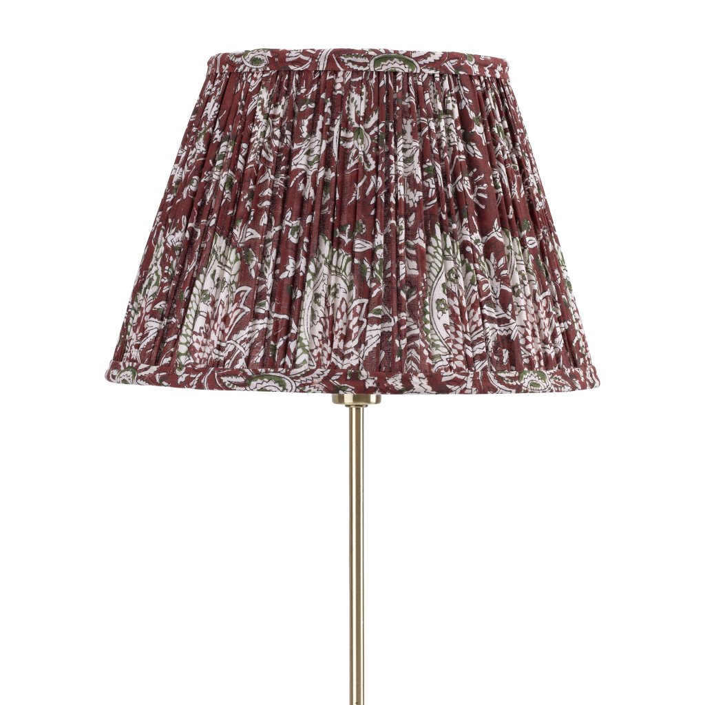 Lampskärmen Oriental är en rund plisserad tygskärm med rött mönster. Du hittar lampskärmar i blocktryckta tyger från Chamois i olika storlekar här hos Longcoast Living.